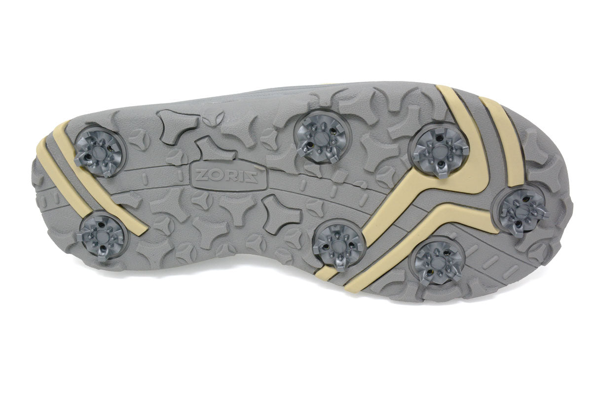 The golf slides from ZORIZ Golf. Our ZORIZ golf slide is built specifically with the golf swing in mind. ZORIZ Slides are constructed with an EVA mid-sole that provides comfort and support. The patented heel has a deeper heel cup and higher sidewalls that help keep your foot in place during the golf swing. A contrasting out-sole consists of removable spikes. The strap style upper is designed to comfortably fit your foot while providing support. An easy-care synthetic upper is padded with neoprene cushioning which holds your foot securely.